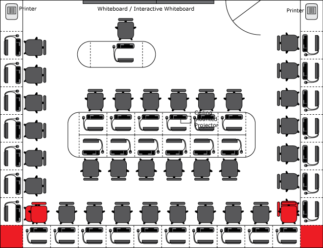 2. Greyhound track - same as doughnut but with extra rows in centre, 34 workstations + teacher