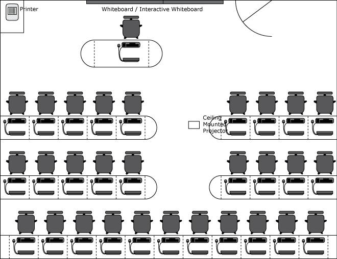 6. Piers - all facing away from teacher, centre isle for access, 29 workstations + teacher